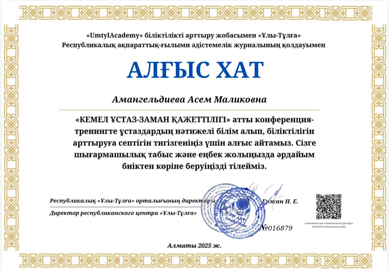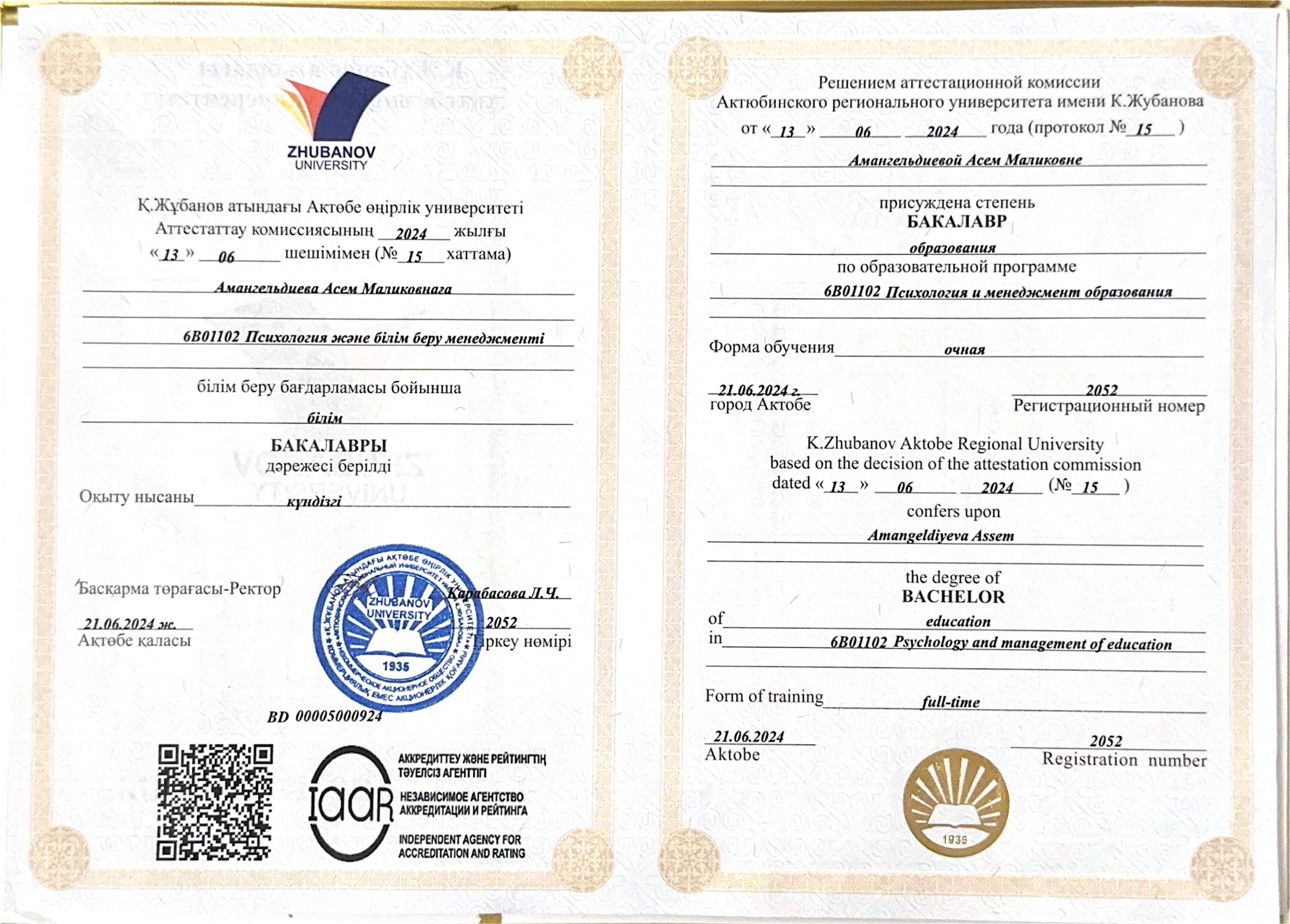 1.Актюбинский региональный университет им. К. Жубанова (бакалавр) 2024г.