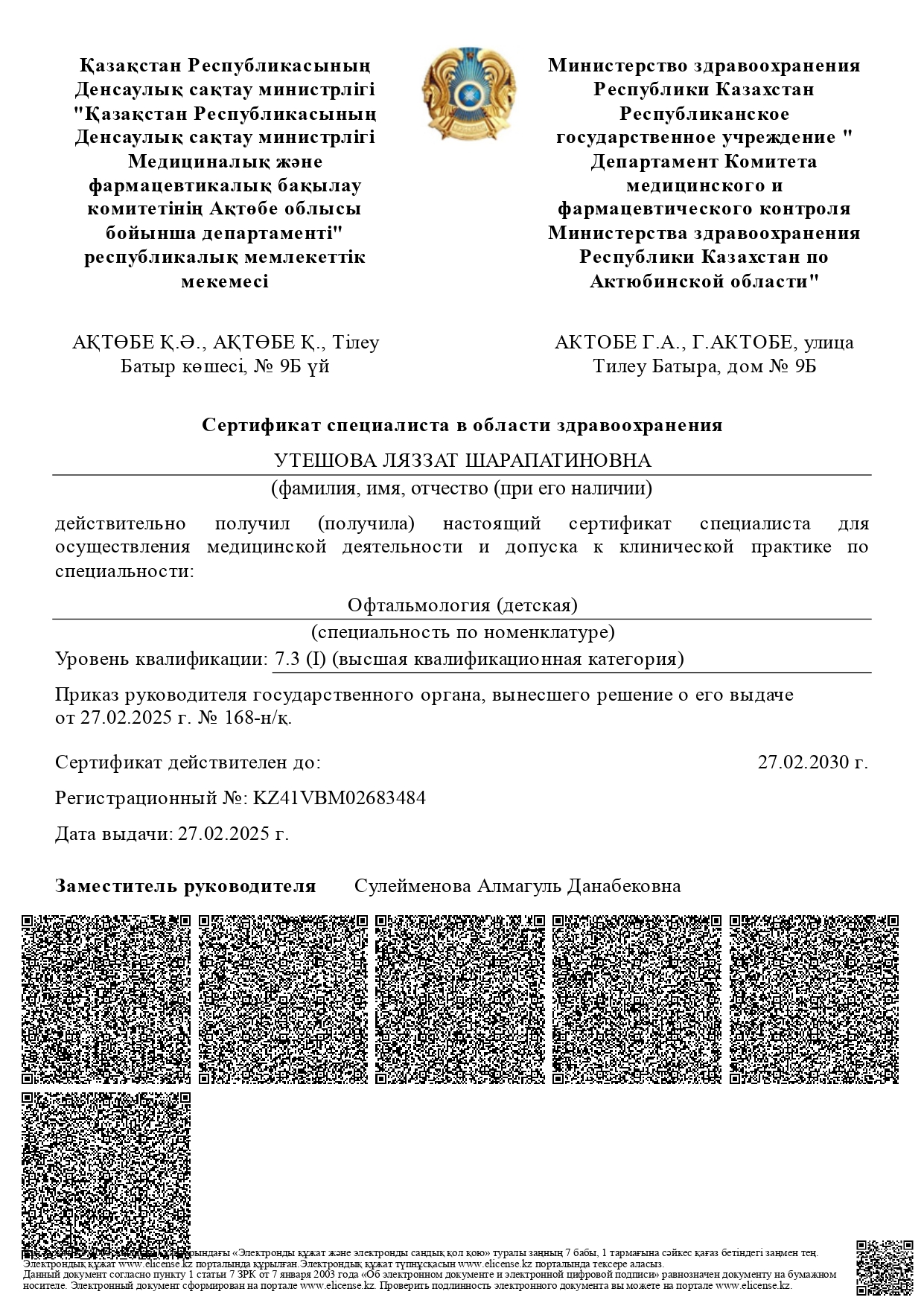 1.Актюбинский Государственный Медицинский Институт 1985-1991 (с отличием)